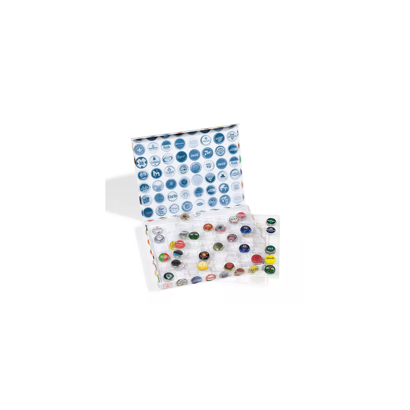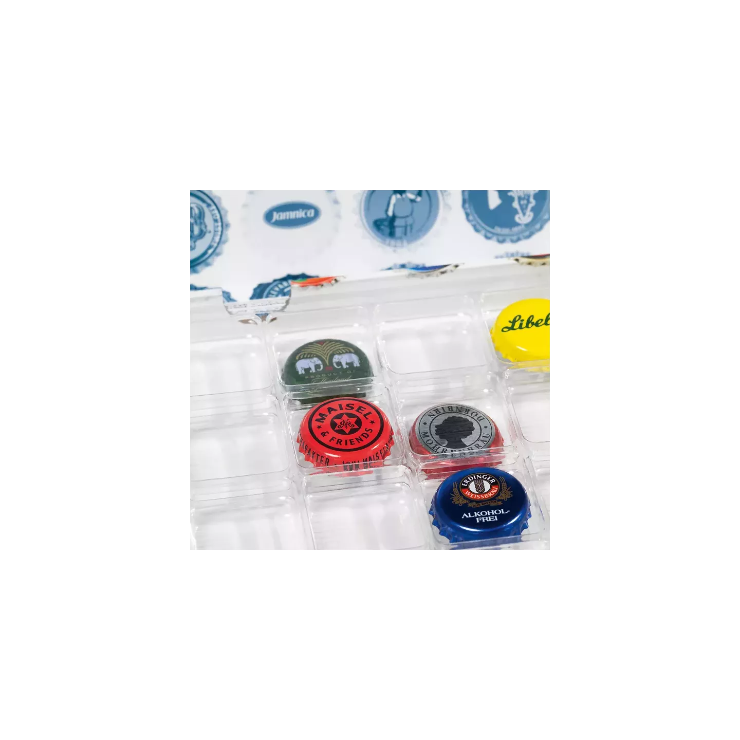 Las chapas de botellas son uno de los objetos exóticos más populares para coleccionar recuerdos de la "cultura pop". Hay muchas chapas de botellas atractivas para coleccionar en todo el mundo y ahora se ha creado una comunidad de coleccionistas leales y entusiastas. Gracias a su forma redonda, las chapas de botellas son similares a las monedas. Por lo tanto, los accesorios para guardar estos artículos también son esenciales para una buena conservación y como medio de presentación atractivo. La caja de coleccionista de Leuchtturm fue desarrollada especialmente para coleccionistas de chapas de botellas. La tapa presenta un motivo que recuerda al espectador cómo es típicamente una chapa de botella. El diseño elegante y de colores brillantes atrae a los coleccionistas más jóvenes y presenta las chapas de botellas como un área de colección interesante y divertida. La caja contiene dos bandejas que se pueden apilar una sobre otra y se han adaptado al tamaño típico de una chapa de botella. ¡Esta colección de chapas de botellas será el centro de atención en cualquier fiesta, garantizado!