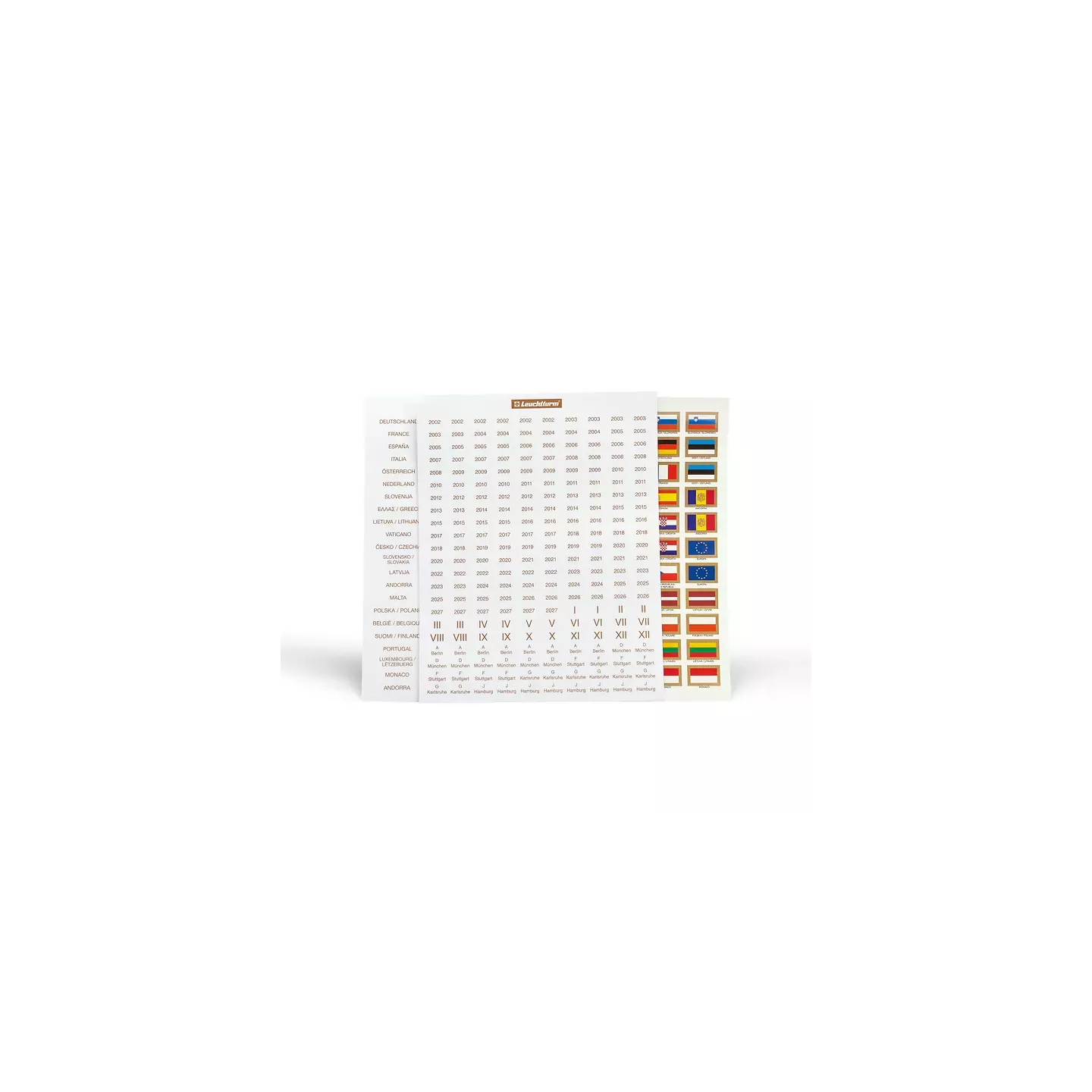 Las etiquetas para monedas de euro son un accesorio indispensable para cualquier colección de monedas. Cada juego contiene tres juegos de banderas autoadhesivas especialmente diseñadas para hojas de monedas de euro. Con un tamaño de hoja de 240 x 190 mm, son compactas y permiten una rotulación clara y ordenada. Las letras doradas incluyen los nombres de las casas de la moneda alemanas, el bando y los números del año de 2002 a 2027, así como juegos de banderas de los 25 países de la zona del euro, entre ellos San Marino, el Vaticano, Mónaco, Andorra y dos banderas europeas, entre ellas Croacia.