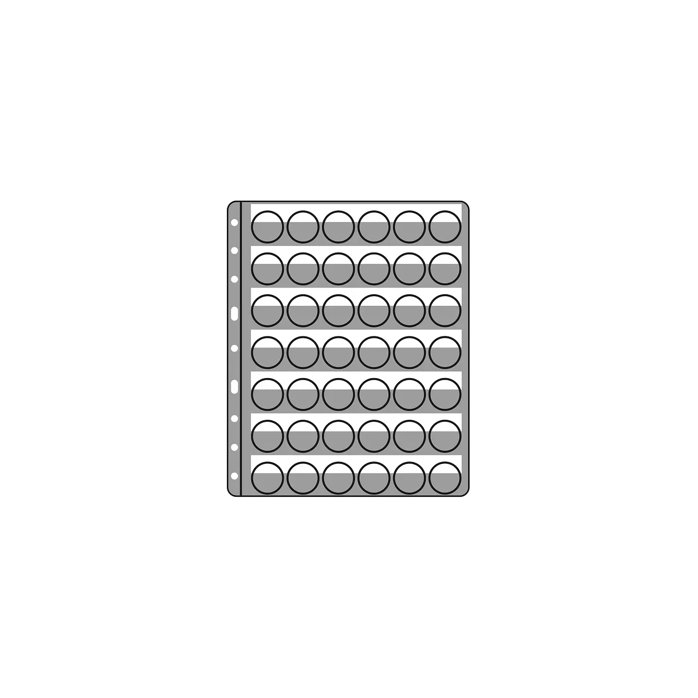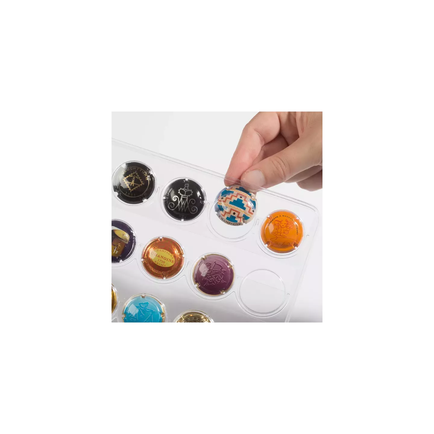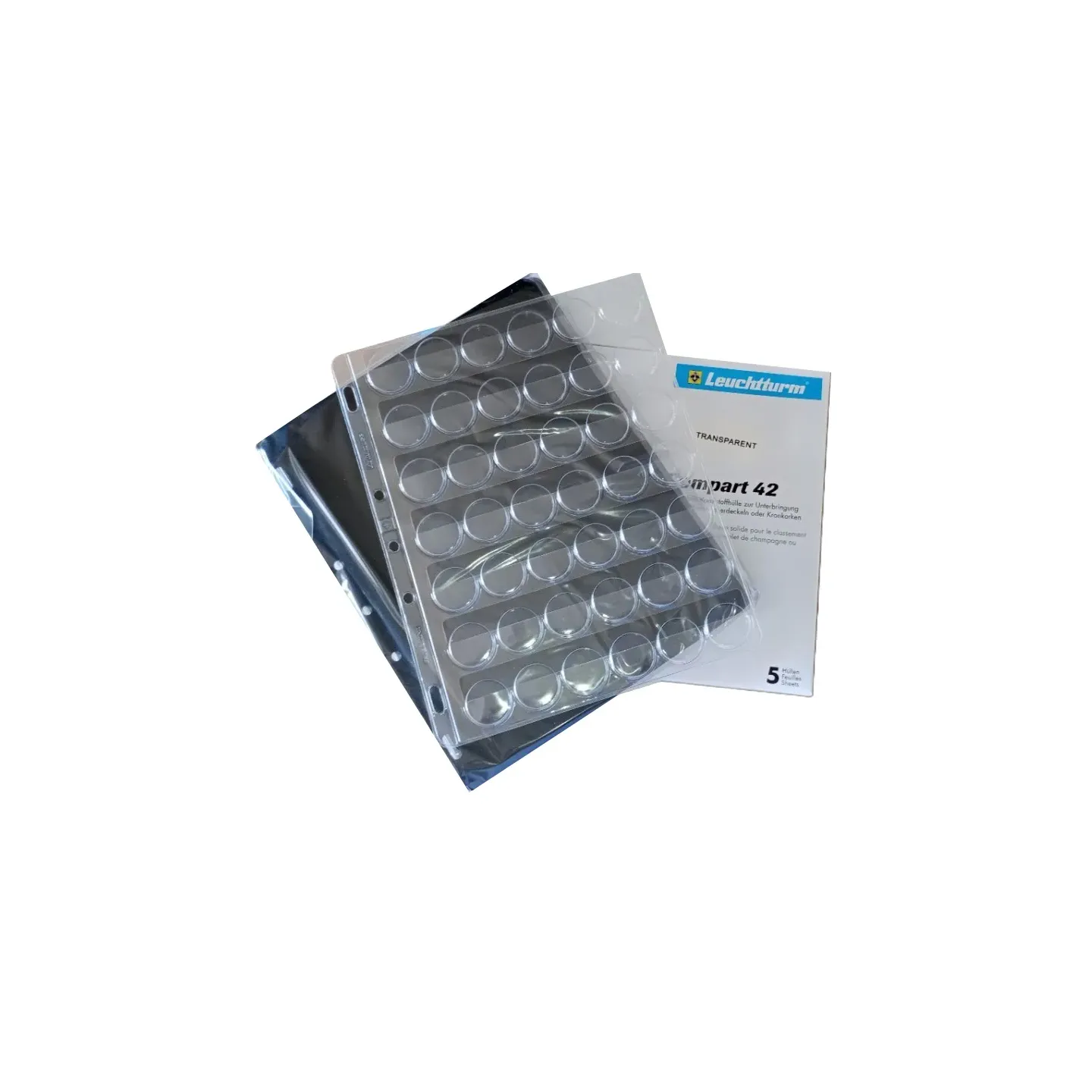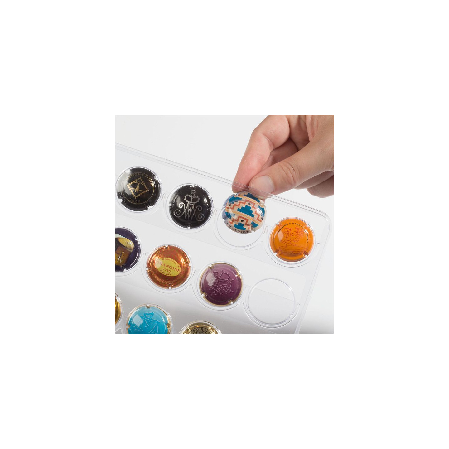 5 hojas de plástico transparente COMPART 42, cada una con capacidad para 42 chapas de champán o de botellas. Fácil de usar: simplemente deslice las chapas de champán o de botellas en los compartimentos desde atrás. Incluye 5 hojas negras intermedias para proteger su colección. Aptas para usar con todas las carpetas GRANDE. Tamaño total: 240 x 296 mm (9 1/2 x 11 5/8").