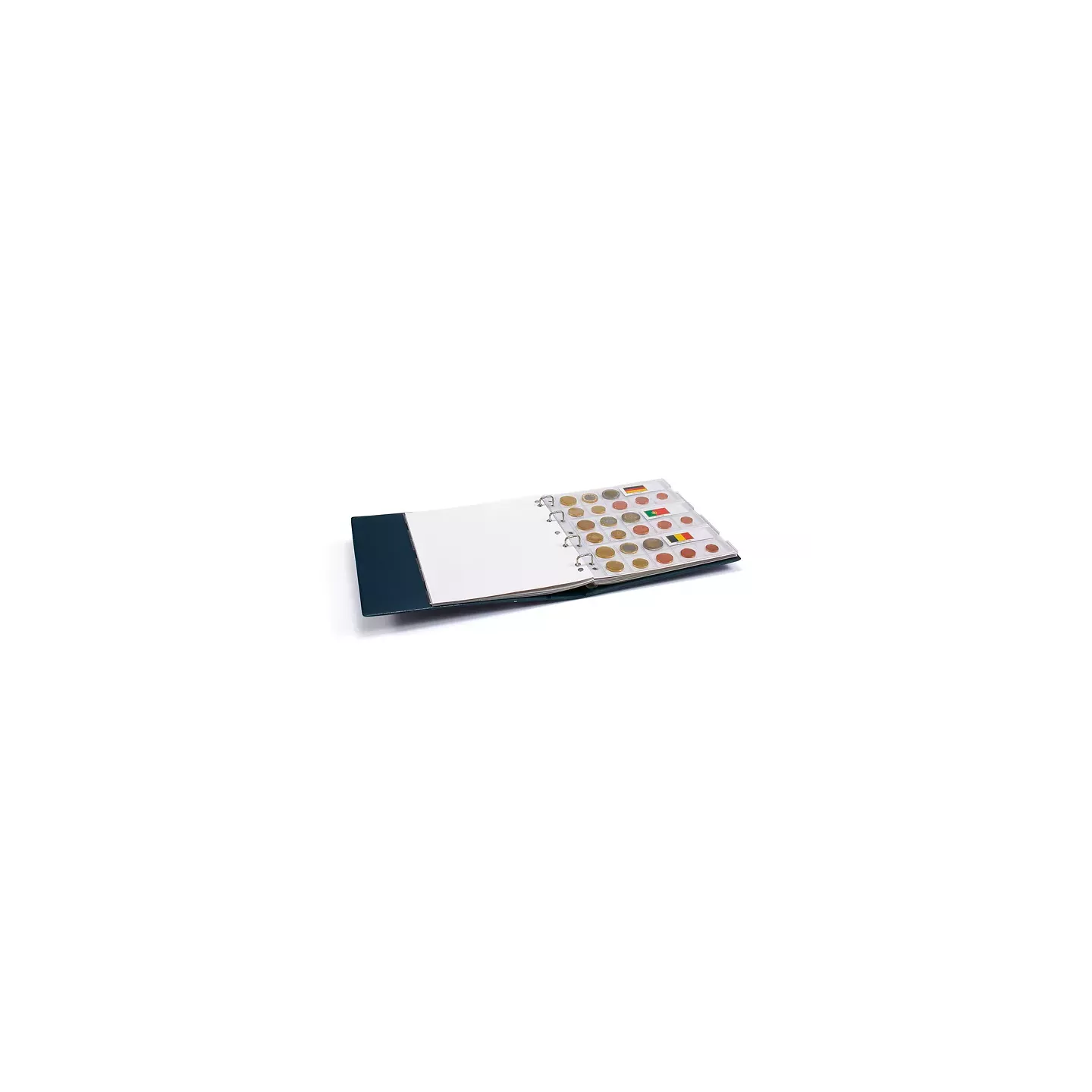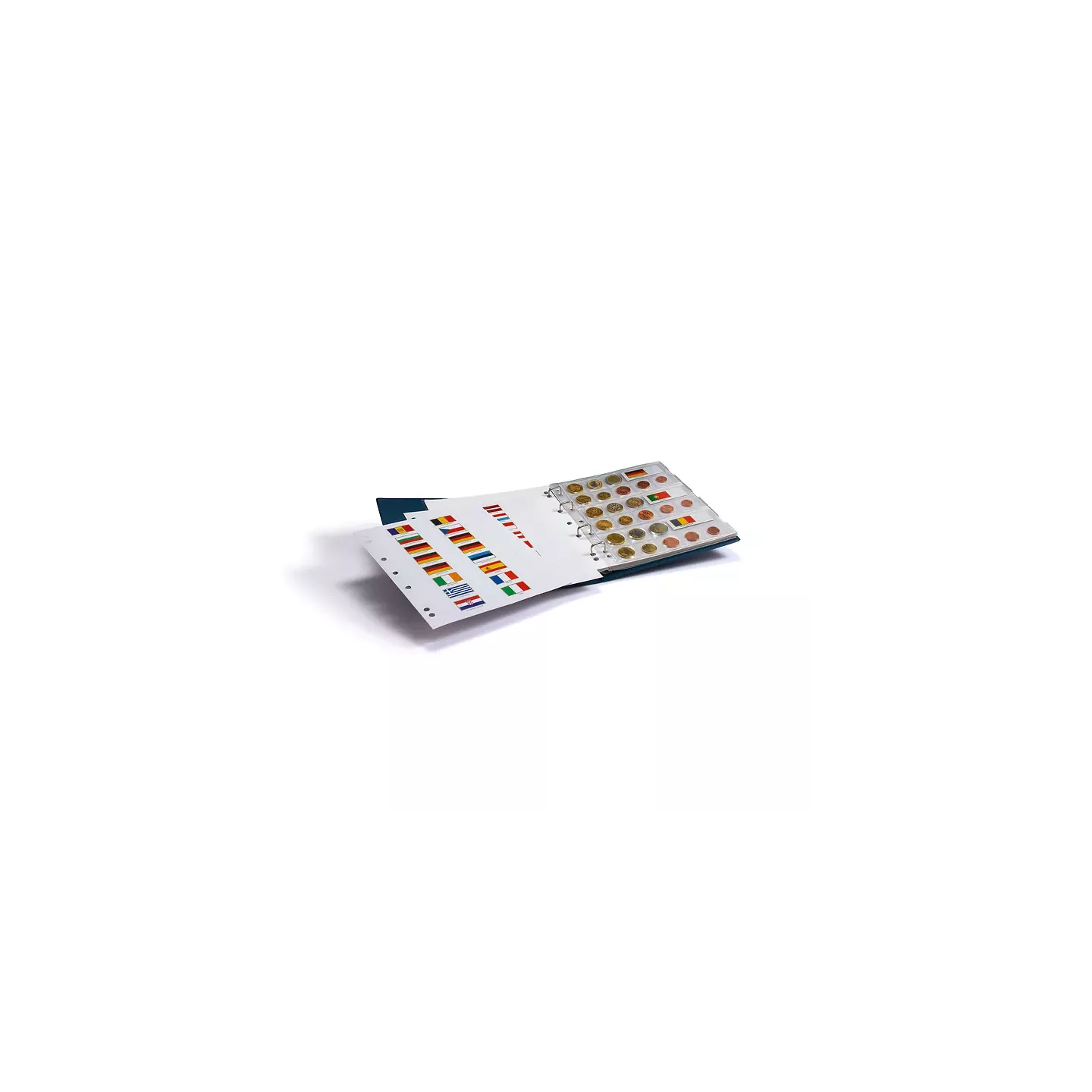 Álbum completo en carpeta azul de 4 anillas de material plástico de calidad, incluye 7 hojas de monedas NUMIS para almacenar 18 juegos completos de monedas de euro e incluye un juego de banderas que permite la opción de etiquetado individual para todos los países de la zona euro.