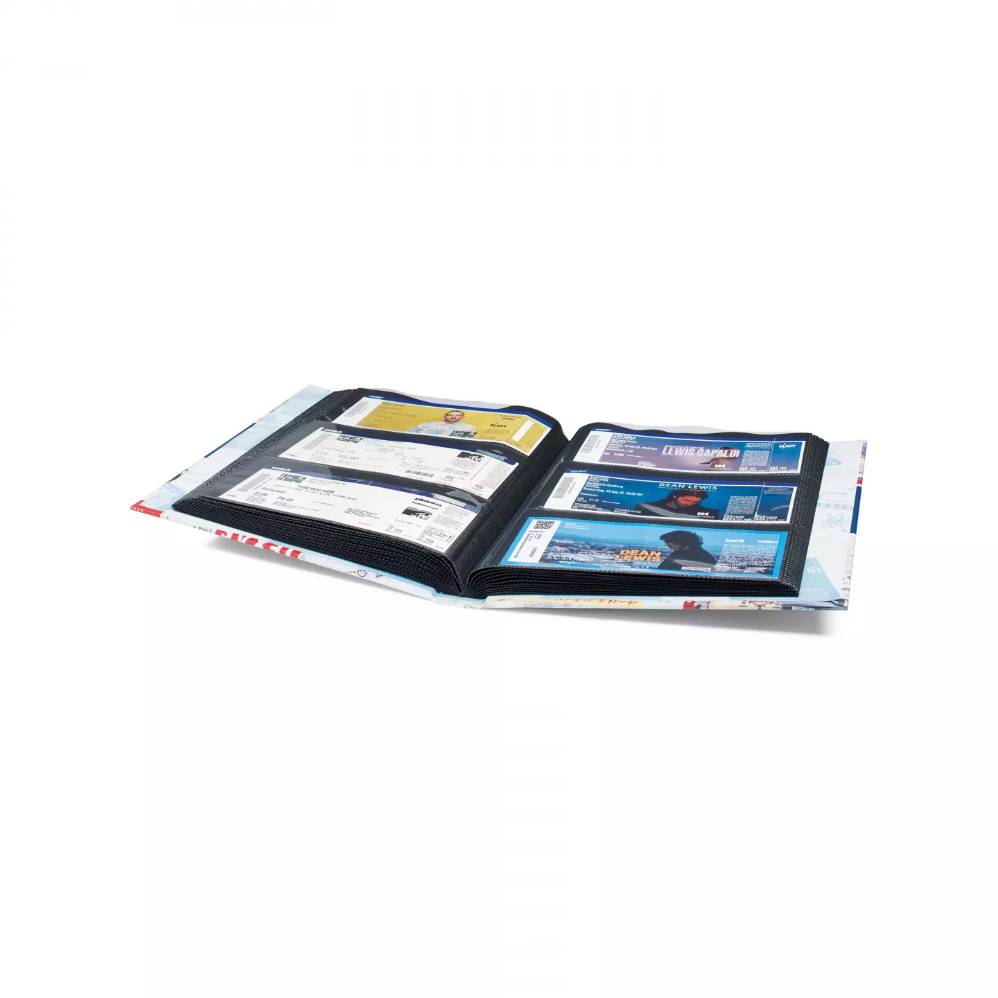 El álbum ofrece espacio para un máximo de 148 billetes y entradas y garantiza su almacenamiento seguro. Dispone de un total de 26 fundas rígidas de doble cara fabricadas en plástico de alta calidad sin plastificantes con capas intermedias negras que muestran perfectamente los billetes. De ellas, 24 fundas están equipadas con tres bolsillos por lado (dimensiones interiores 220 x 98 mm). Los bolsillos están abiertos en la parte superior para poder introducir fácilmente los billetes. Dos bolsillos adicionales de doble cara en el centro del álbum ofrecen un bolsillo por lado (dimensiones interiores 220 x 304 mm) y proporcionan espacio suficiente para billetes extragrandes, formatos especiales o folletos de formato A4.