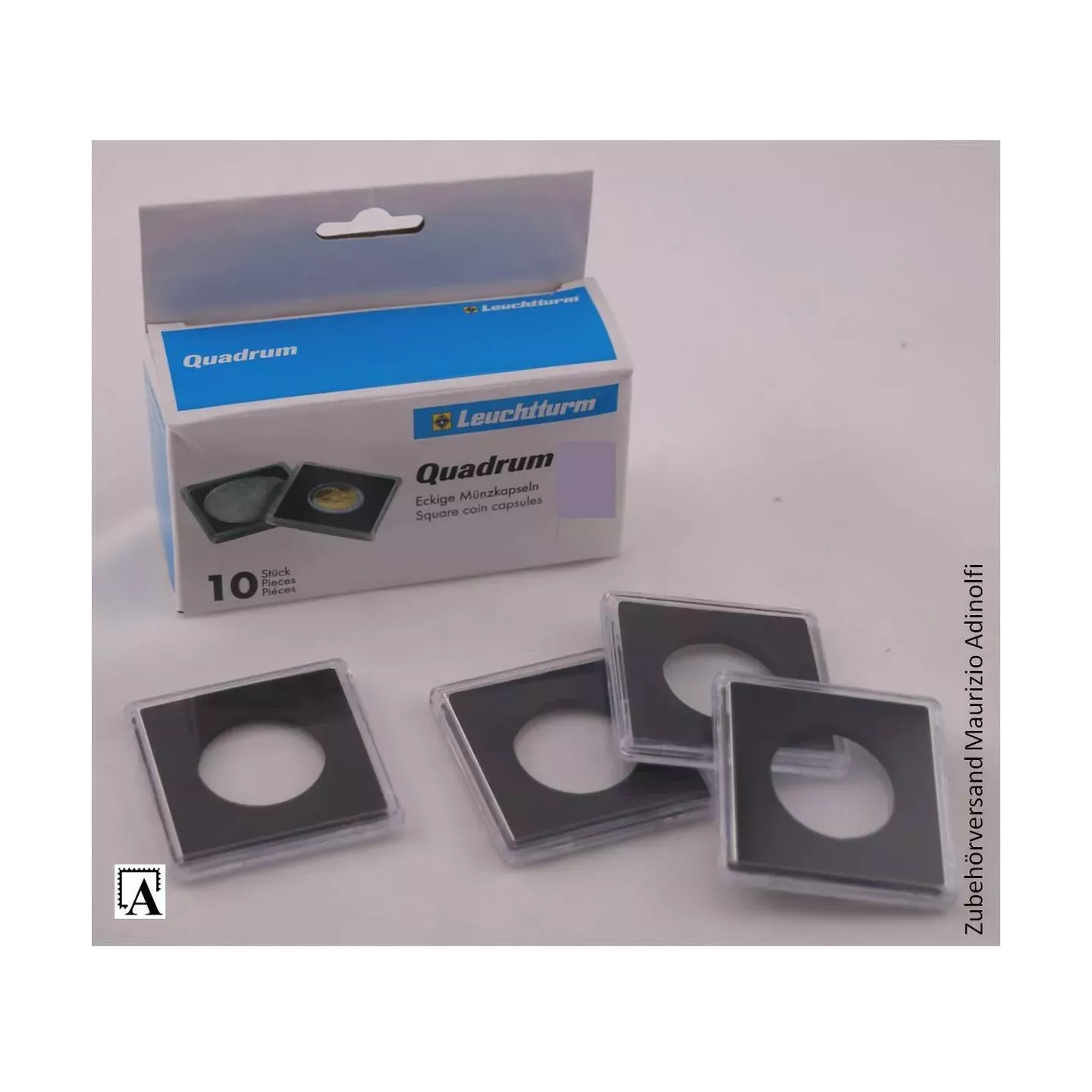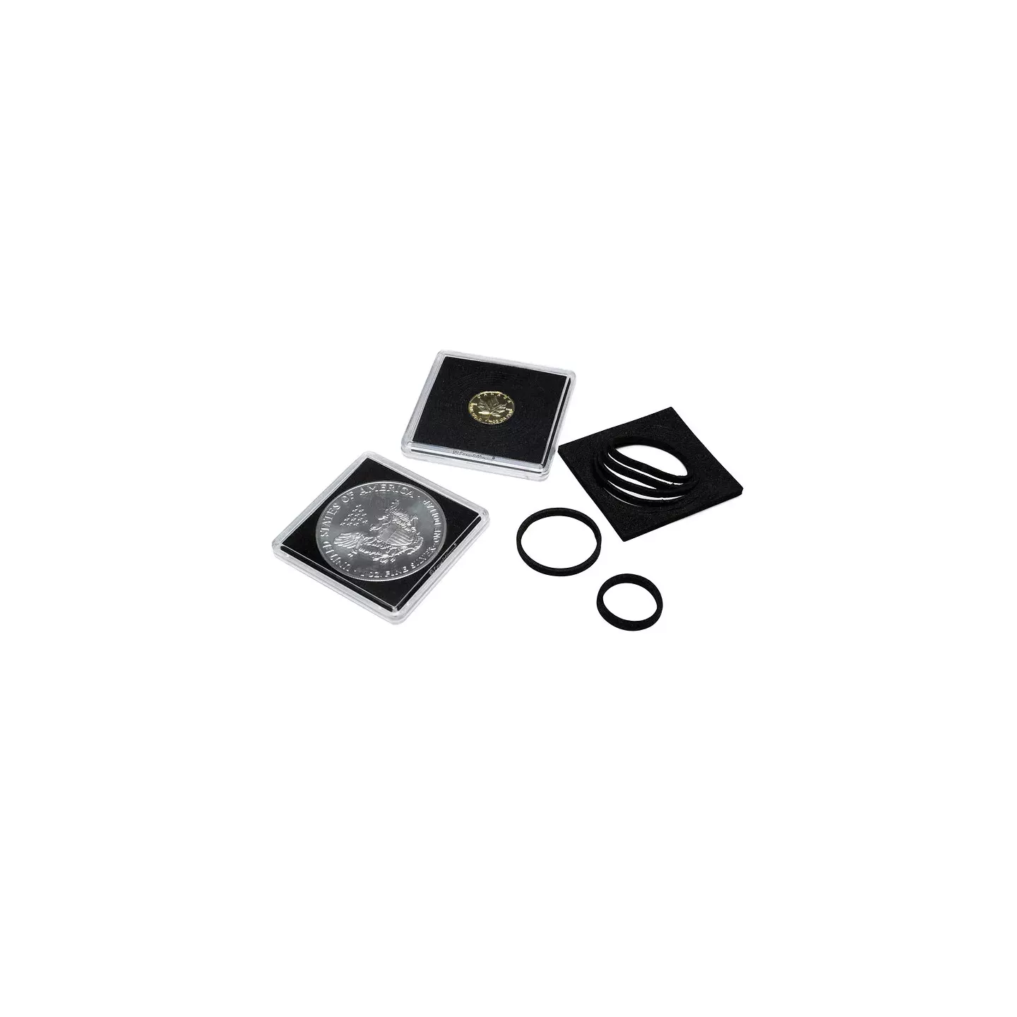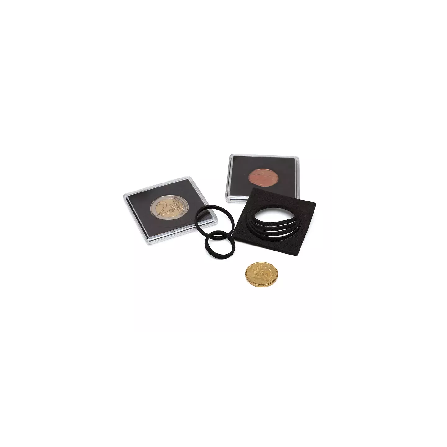 las colecciones de monedas de todo el mundo durante muchos años. Los coleccionistas valoran poder almacenar sus monedas fácilmente y presentarlas de forma atractiva. Leuchtturm ha desarrollado una ingeniosa innovación que facilitará el manejo de las cápsulas a los coleccionistas más apasionados: la cápsula QUADRUM incluye anillos de diferentes tamaños, lo que permite ajustarla fácilmente para albergar monedas con diámetros de entre 16 y 41 milímetros. De esta forma, los coleccionistas ya no necesitan comprar cápsulas QUADRUM de diferentes diámetros. Las monedas se han seleccionado para los diámetros más comunes. El popular sistema QUADRUM garantiza la máxima flexibilidad, además de calidad y seguridad comprobadas para todos los coleccionistas.
