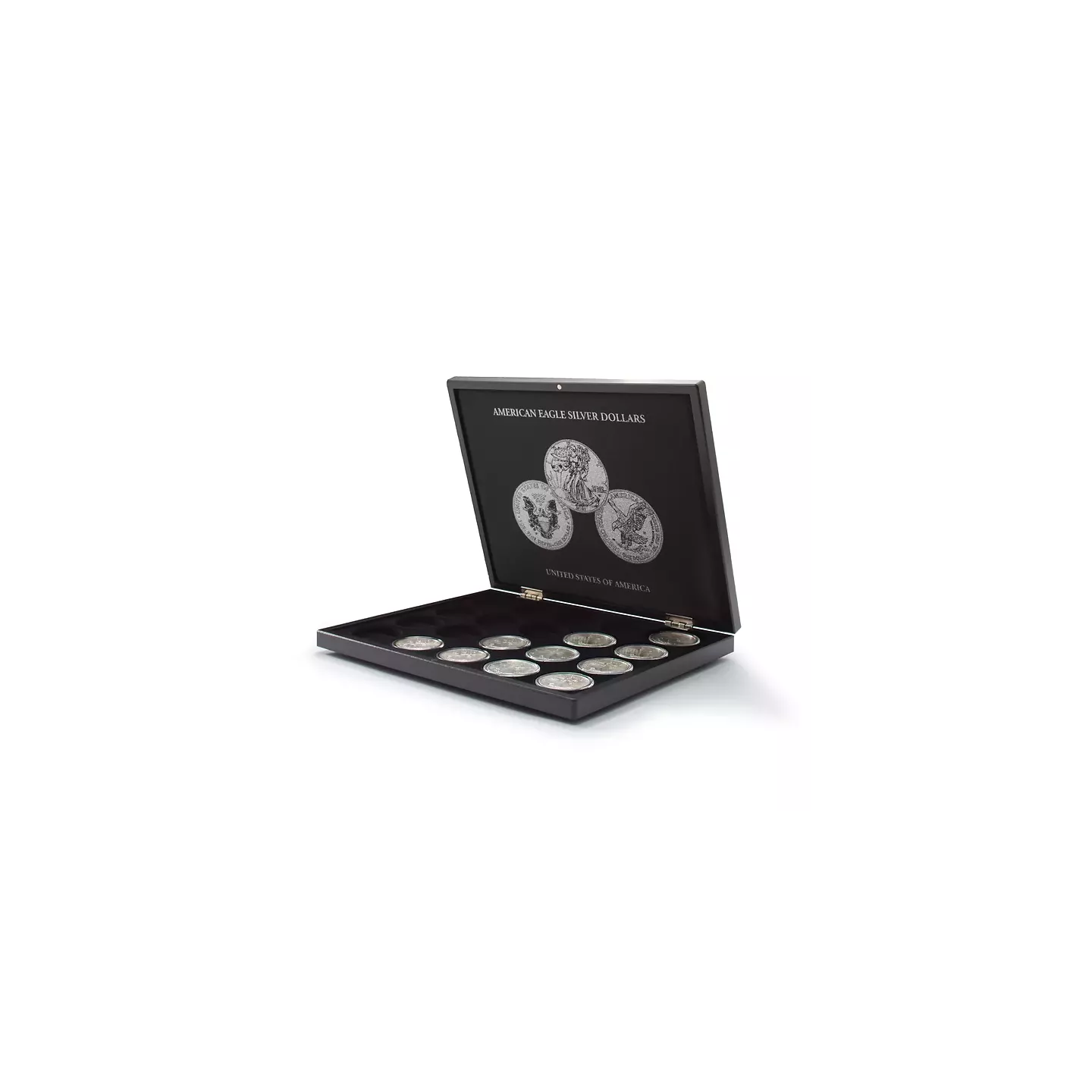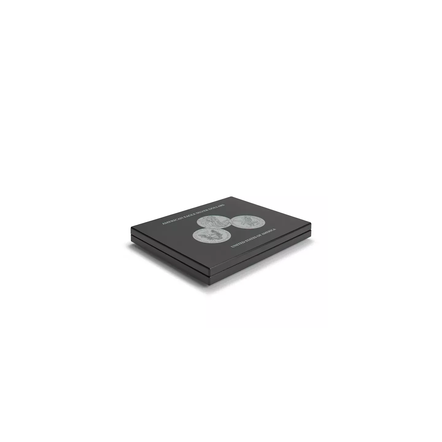 Elegante estuche de color negro para 20 monedas de plata American Eagle (modelo de 1 oz.) en cápsulas (Ø interior 41 mm). 1 bandeja con superficie aterciopelada de color negro y 20 divisiones redondas (Ø 47,5 mm). Con grabados en color plata en la tapa y en su parte interior con motivo de la moneda. Interior de la tapa acolchado con raso negro. Con un cierre magnético seguro y discreto. Tamaño exterior: 305 x 30 x 245 mm. Las cápsulas no están incluidas.