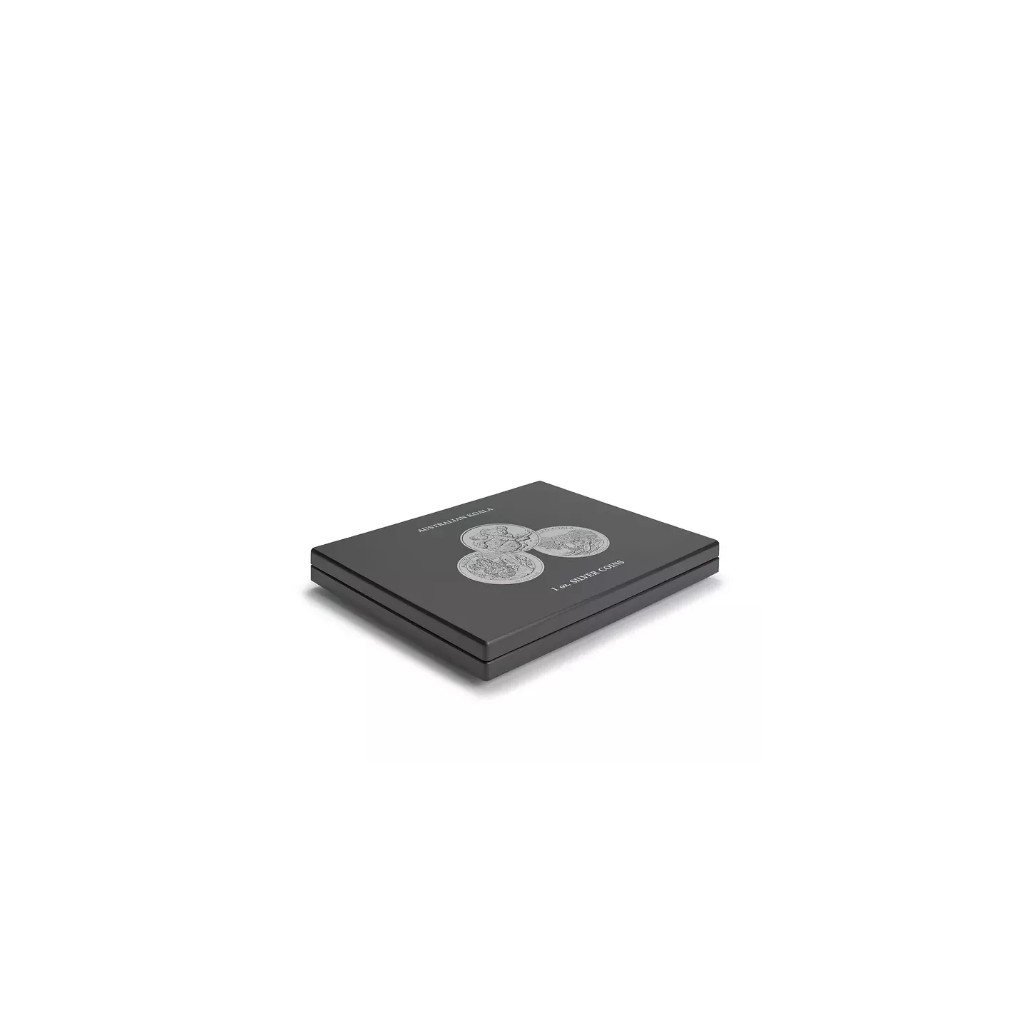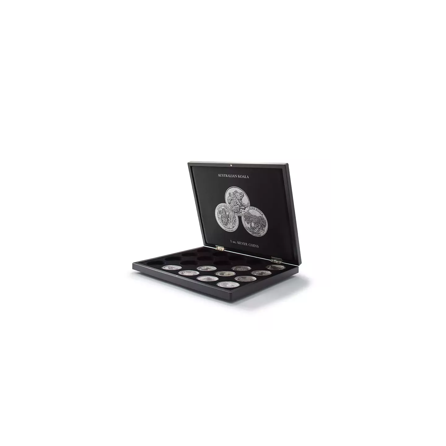 Elegante estuche de color negro para guardar 20 monedas de plata Koala (modelo de 1 oz.) en cápsulas originales. 1 bandeja con superficie aterciopelada de color negro y 20 divisiones redondas (45,4 mm Ø). Con grabados en color plata en la tapa y en su parte interior con motivos de las monedas Koala. Interior de la tapa acolchado con raso negro. Con un cierre magnético seguro y discreto. Tamaño exterior: 305 x 30 x 245 mm.