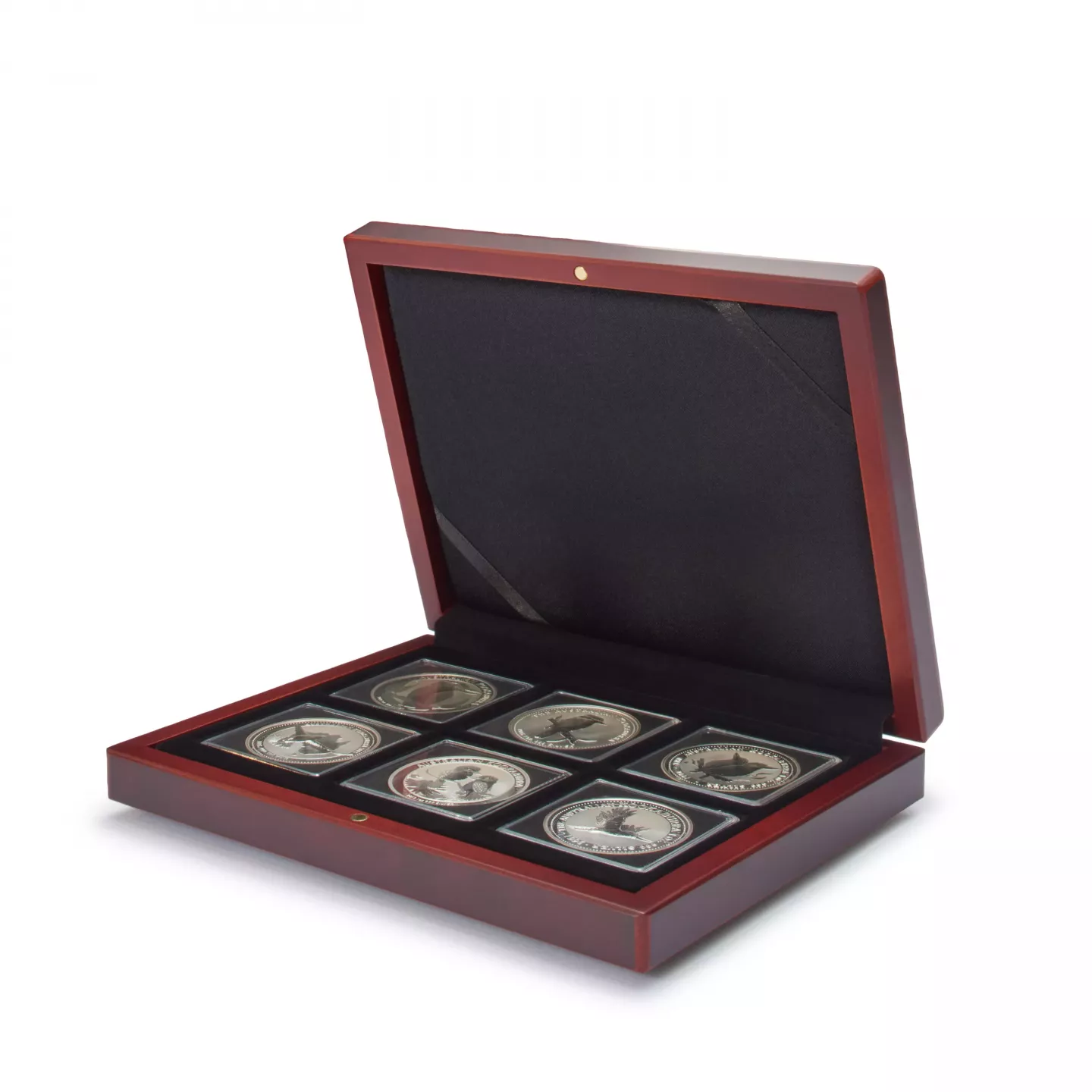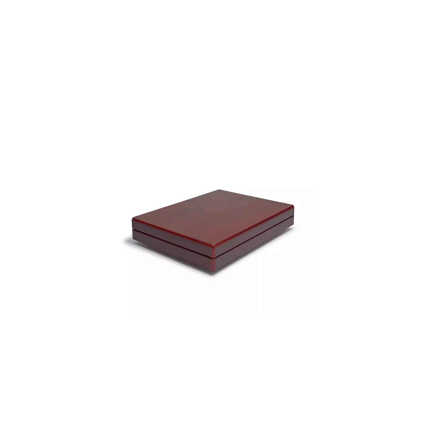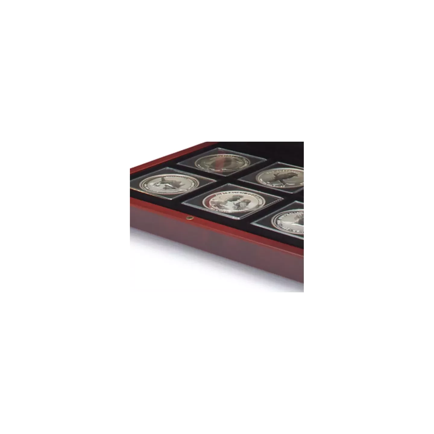 Estuche de alta calidad de madera color caoba para cápsulas cuadradas QUADRUM. Interior de la tapa acolchado con raso negro, con la superficie interior aterciopelada. Divisiones de tamaño 50 x 50 mm. Con una tira de raso en el interior de la tapa para guardar certificados. Estos estuches sirven para guardar cápsulas diferentes. Hay dos modelos diferentes de una división, con diferente formato del estuche. Este puede ser de 80 x 80 mm, o de 95 x 95 mm.