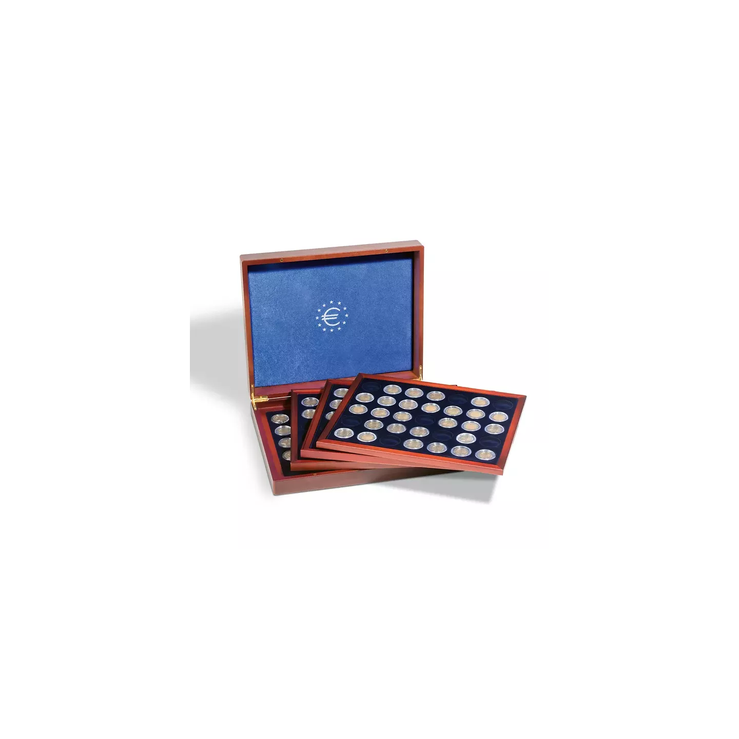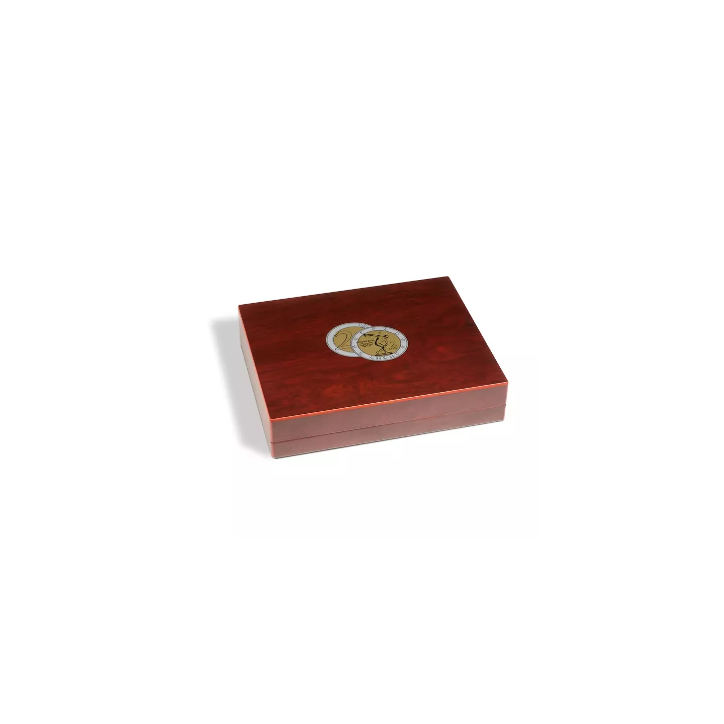 Este monedero de alta calidad en elegante madera veteada de color caoba ofrece espacio para 140 monedas de 2 euros en cápsulas (Ø interior 26 mm). Tiene cuatro incrustaciones con superficie azul aterciopelada y 35 campos redondos cada una (Ø 32 mm). El marco de madera garantiza una estabilidad especial de las plaquitas. El cofre se caracteriza por su elegante estampado de tapa y cojín, con el cojín de la tapa tapizado en satén azul. Un cierre magnético seguro y discreto redondea el diseño de alta calidad. Dimensiones exteriores: 330 x 70 x 270 mm. Las cápsulas no están incluidas.