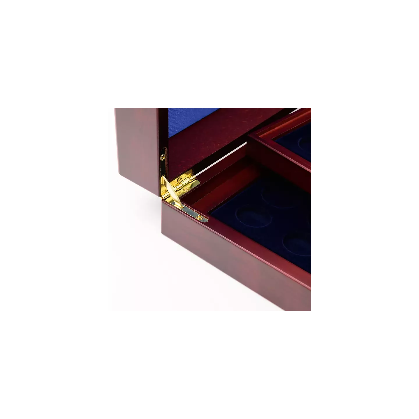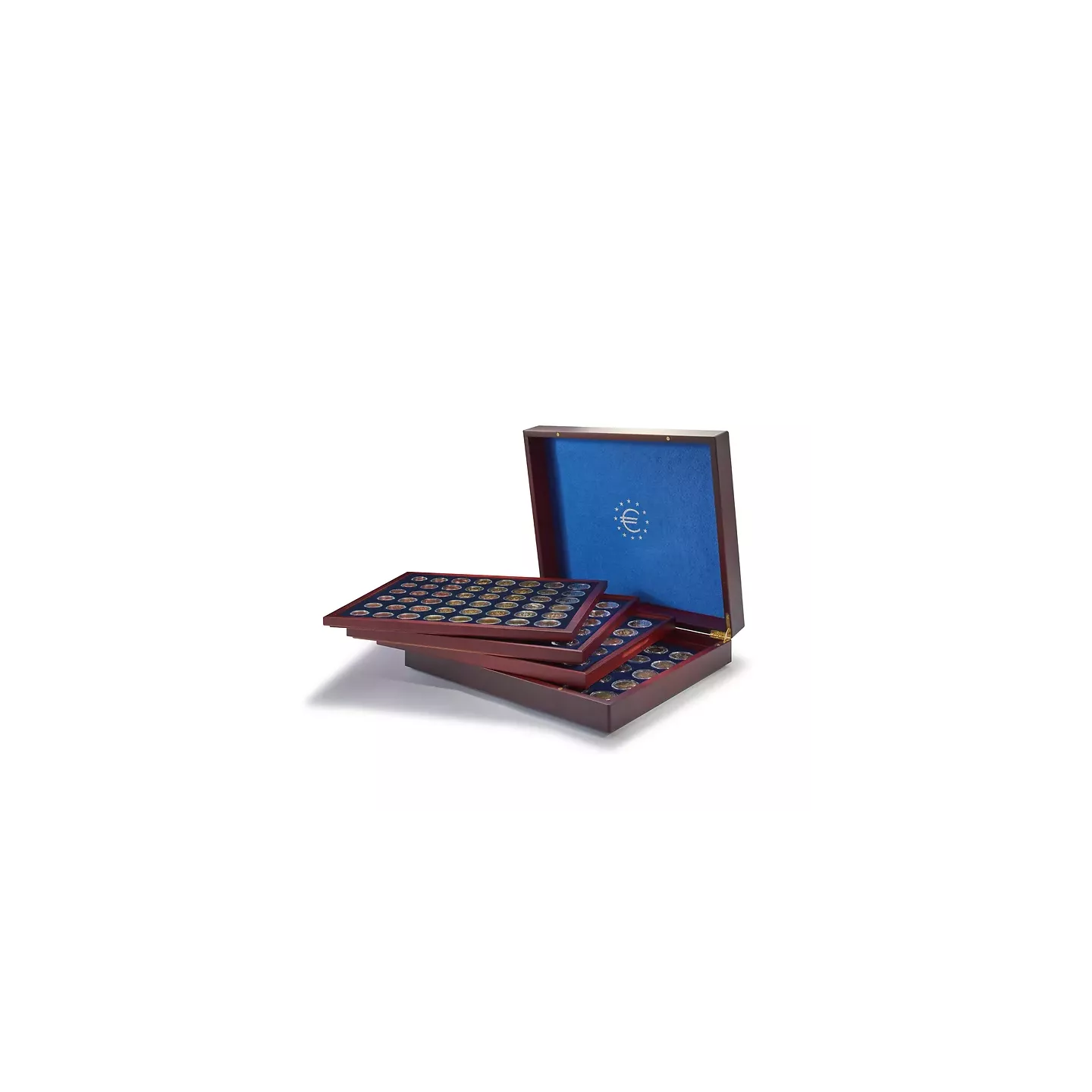 Nuestro estuche para monedas en madera veteada de color caoba es la solución ideal para guardar 24 juegos de monedas de euro en cápsulas (de 1 céntimo a 2 euros). El estuche se suministra con 4 insertos, cada uno con una superficie aterciopelada en azul y 48 compartimentos redondos para 6 juegos de monedas de euro. Los insertos son especialmente resistentes gracias a un marco de madera. El cojín de la tapa está acolchado con satén azul y decorado con un estampado plateado. Un cierre magnético seguro y discreto garantiza que las monedas se guarden de forma segura. Las dimensiones exteriores del estuche son 332 x 272 x 68 mm.
